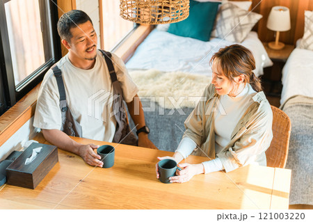 コテージ,キャビン,ログハウスでコーヒーを飲みながコテージ,キャビン,ログハウスら笑顔で会話する夫婦