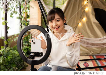 お家時間 ハンモックでくつろぎながらスマートフォンを使う女性