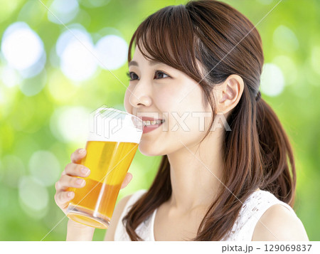 バーベキューを楽しむ笑顔の女性のイメージ素材