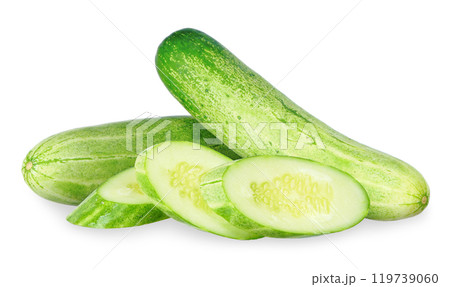Cucumber cut isolated, cucumber slices macro, green vegetable cuts for salad isolated, healthy fresh pieces