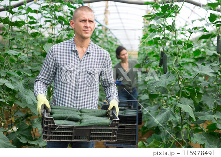 Green cucumber in home garden greenhouse. Concept of locally grown organic vegetables food produce. Countryside