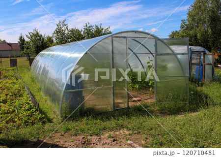 Polycarbonate greenhouse with seedlings on a sunny day in the garden in summer