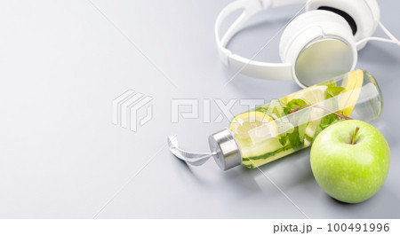 glass bottle with infused water with lemon, cucumber, mint and ice. Healthy summer drink.