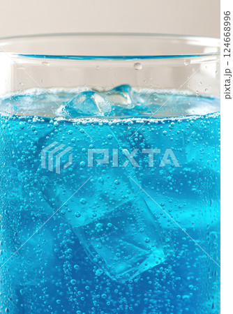 清涼感あふれるブルーソーダと氷のクローズアップ(AI生成画像)