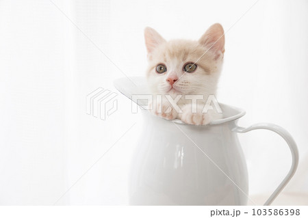 水差しに入ったスコティッシュフォールドの仔猫