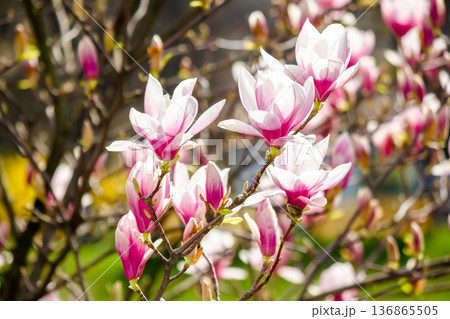 magnolia x soulangeana saucer tree in full bloom. branches of the shrub with big pink flowers. fresh scent of fragrant beauty in early springtime. floral background for longevity symbol