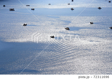 銀色に輝くウチノ海とタイの釣り棚 徳島県鳴門市