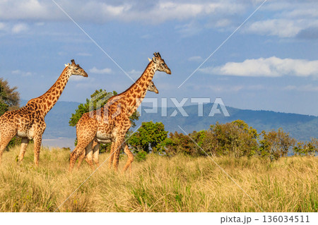 Group of giraffes walking in Ngorongoro Conservation Area in Tanzania. Wildlife of Africa