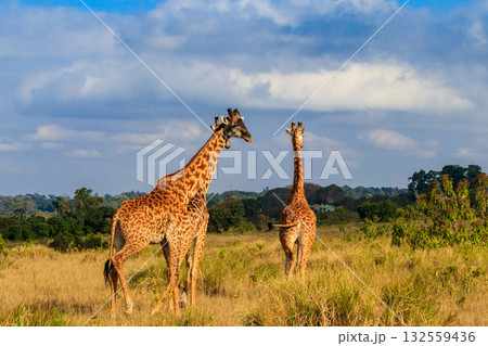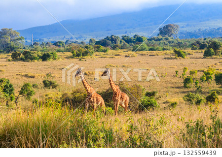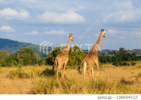 Pair of giraffes walking in Ngorongoro Conservation Area in Tanzania. Wildlife of Africa