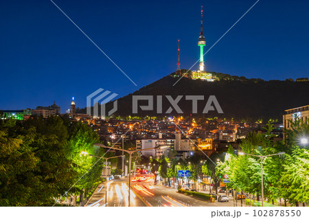 ソウル ライトアップされたNソウルタワーと緑莎坪大路