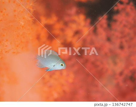 ソフトコーラルの中で泳ぐスズメダイ