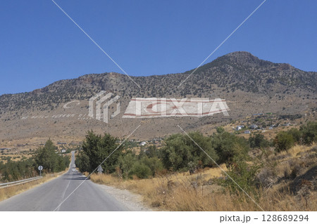 キレニア山脈にある北キプロス・トルコ共和国の国旗の写真