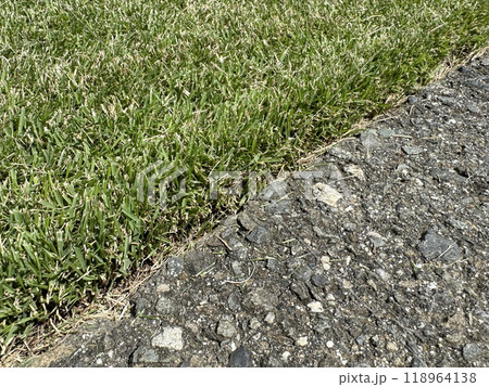 側溝ぶたの脇に咲いているカタバミの黄色い花や雑草たち/The yellow flowers