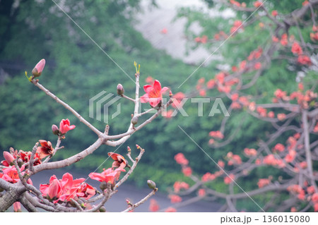 The view of Cotton Tree (Bombax ceiba) in the outdoors in cloudy day. Red flowers on the tree. Flower and plant.