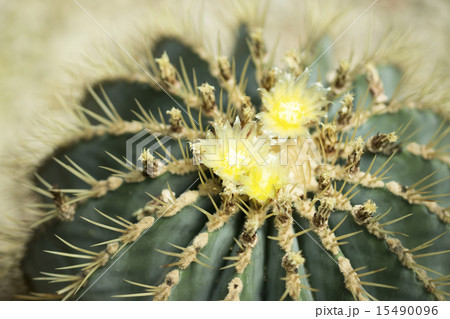 Top view of Parodia leninghausii (Lemon ball cactus) or Echinocactus grusonii (Golden barrel cactus).