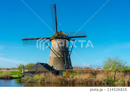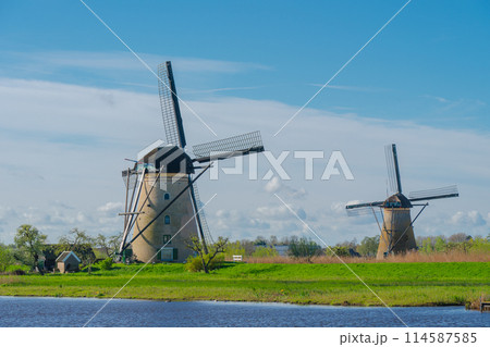 西ヨーロッパのオランダ 南ホラント州ロッテルダム近郊のキンデルダイクの世界文化遺産になっている風車群