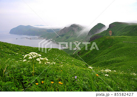 礼文島の花 オオカサモチとレブンキンバイソウの咲く桃岩展望台コースから桃岩や礼文岳を望む