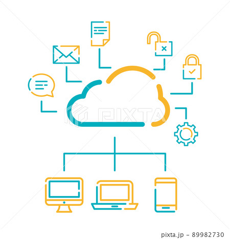 ポップなアイコンの端末とクラウドイメージ ブルーとイエロー