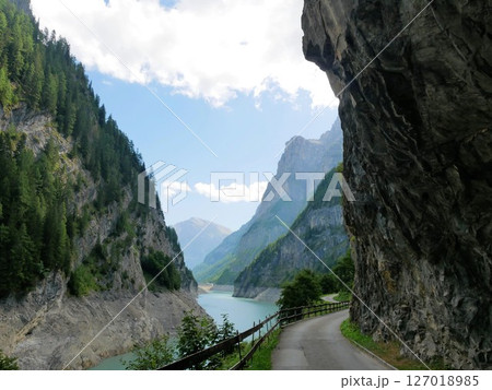 スイスのダム湖 ギガーヴァルト湖(Lake Gigerwald)沿いの道路(ザンクトガレン州)