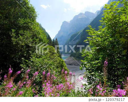 夏のギガーヴァルト湖 Gigerwaldseeの風景 (スイス、ザンクトガレン州)