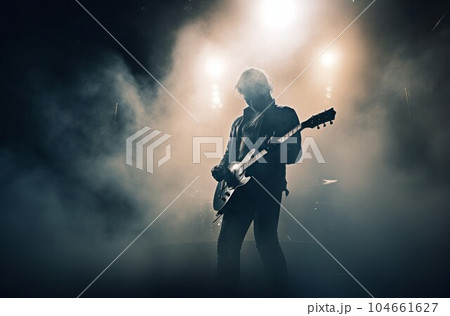 Guitar player smoke. Band stage. Fictional person. Generate Ai