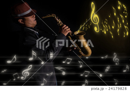A saxophone player in a dark background with music melody, musical concept