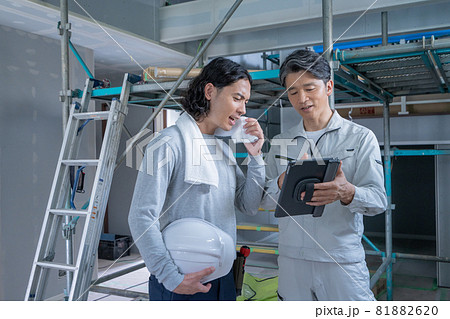 建築現場で汗を拭く若い男性