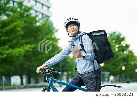 都会で自転車に乗りデリバリーをする男性