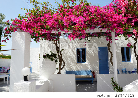 traditional mediterranean white house with clay tile roof and vivid pink bougainvillea flowers