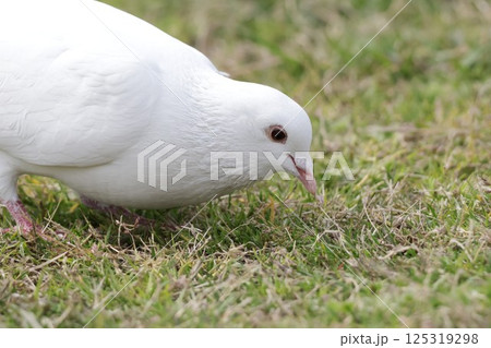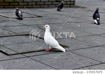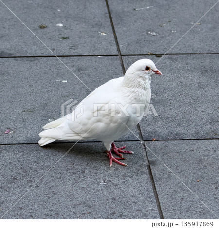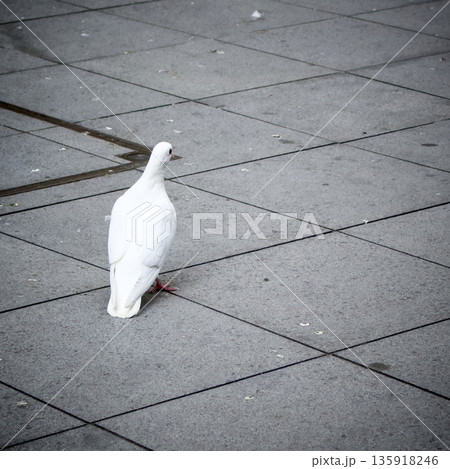 広場の路上に一羽の白い鳩が横を向いて立っている