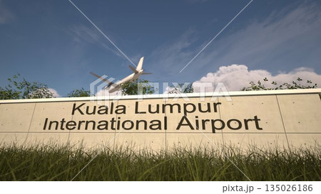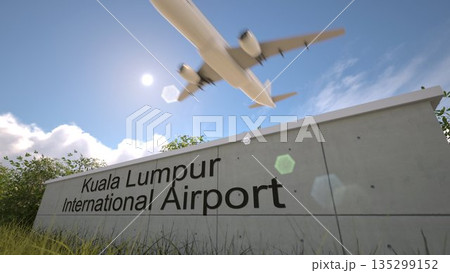 Kuala Lumpur International Airport entrance sign and airplane passing above on a summer day, Kuala Lumpur, Malaysia 3D rendering