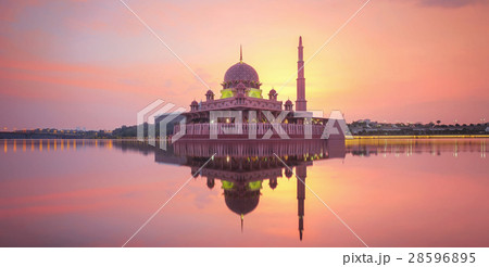 Aerial View Of Putra Mosque with Putrajaya City Centre with Lake at sunset in Putrajaya, Malaysia.