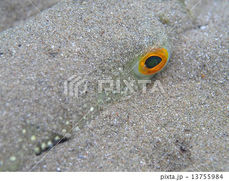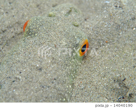海底の砂浜で潜むメゴチと海面を泳ぐクサフグ