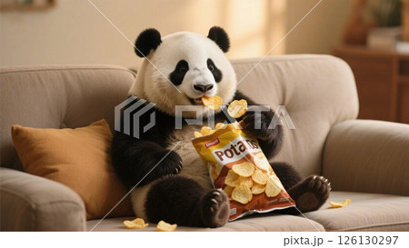 くすっと笑える、ソファの上でポテトチップスを食べるパンダのイラスト