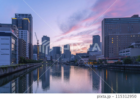 朝焼けに染まる中之島のビル群(中之島バンクス付近)