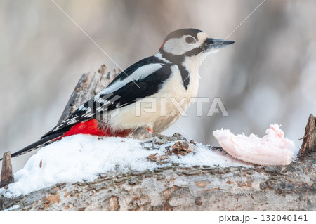 Little woodpecker sits on a tree trunk with snow in winter. The great spotted woodpecker, Dendrocopos major