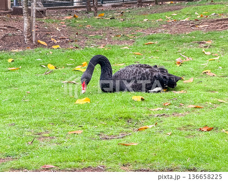 Black swan resting on green grass in a park. Wildlife, beauty, nature and animal observation in natural outdoor environment.