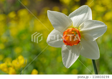 菜の花畑の黄色の中に咲いた白いスイセン