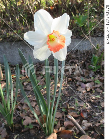 日本の早春の庭に咲く白い花びらにオレンジ色の副花冠を持つ口紅水仙の花