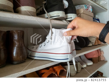 Female hands choosing boots shoe cupboard comfortable storage organize closeup top view