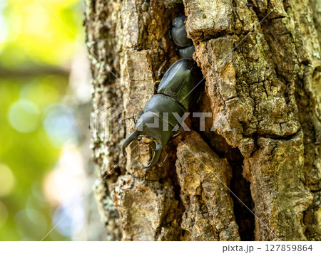 クヌギの木にいるノコギリクワガタ