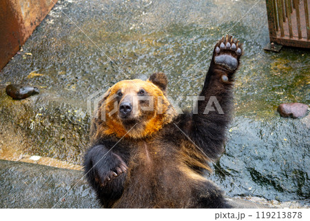 座って餌をねだるクマ(奥飛騨クマ牧場)