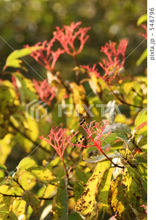 自然 植物 クマノミズキ、九月中旬。赤く見えるのは実の付いた小枝。小枝も緑色から赤色に色づきます