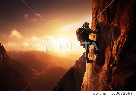 Determined Man Climbing the Mountain's Peak Against the Setting Sun, created with Generative AI