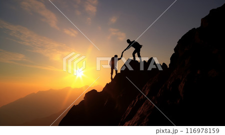Silhouette of Climbers Mutual Assistance and Teamwork, Climb Mountain, Teamwork friendship hiking help each other trust assistance silhouette