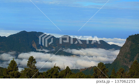 Sea of clouds view from a mountain peak though the pine trees against a background of clouds and a blue sky in Thailand.