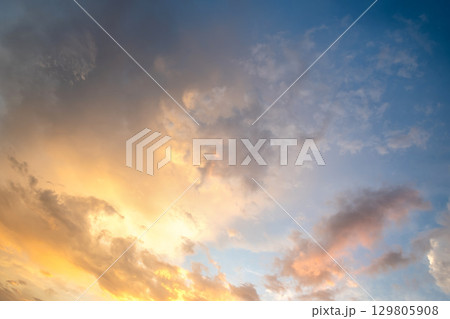 Dramatic sunset sky covered with colorful yellow clouds. Panoramic skyscape