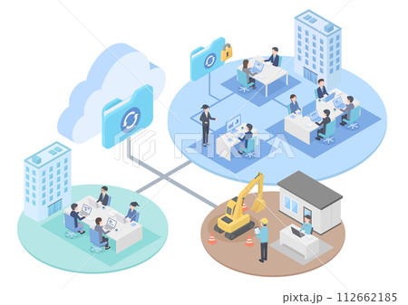 建設現場と企業のクラウド化をイメージしたアイソメトリックイラスト