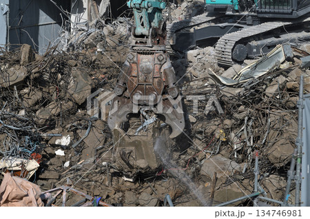 取り壊される老朽化したビル 大型重機での解体の作業風景