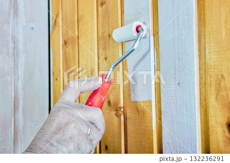 Need to refresh appearance of tongue and groove walls seems to have arisen, painter uses roller to cover old panels with first layer of white paint near corner.